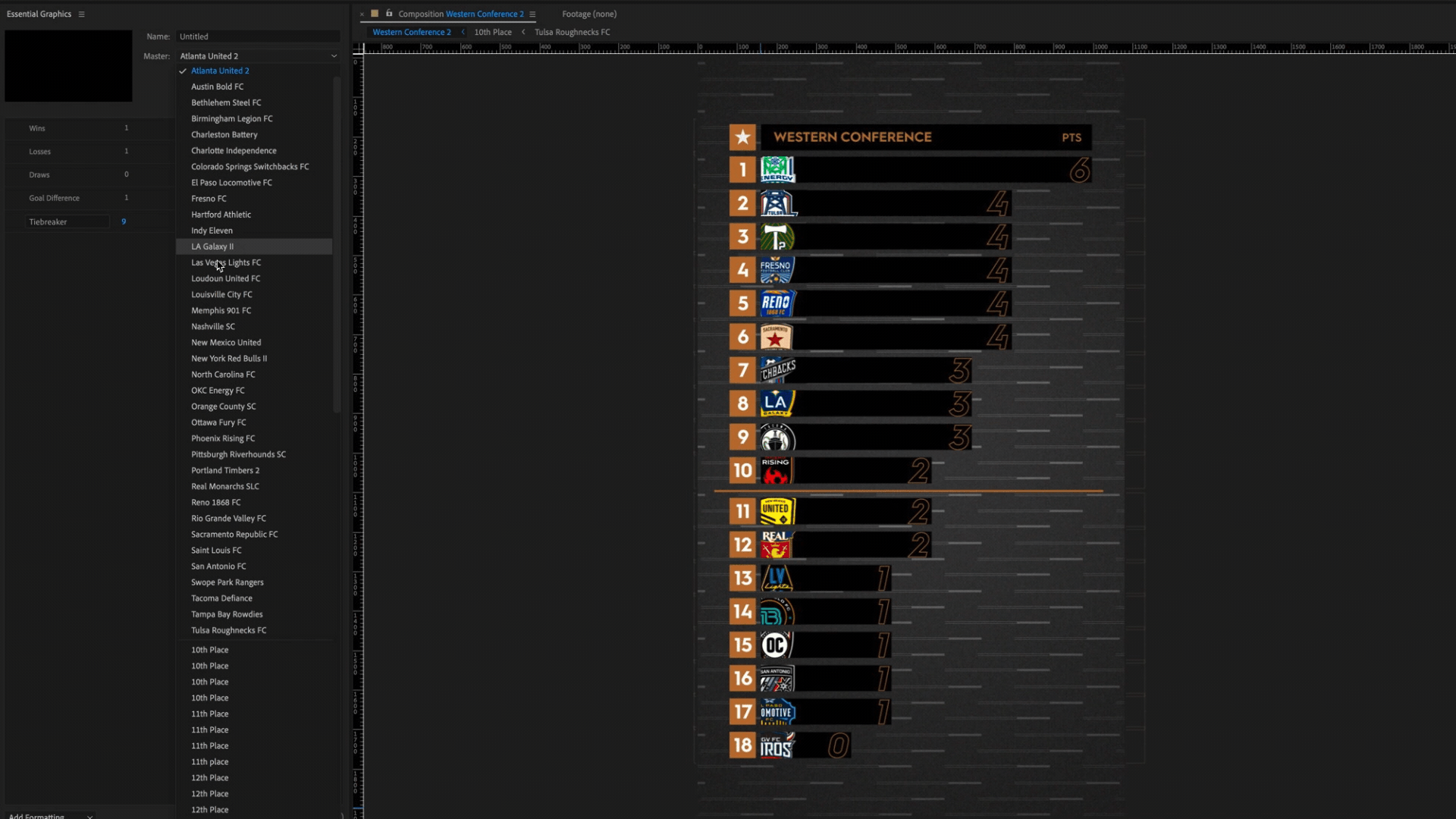 Every week, the USL Championship posts an update to their league standings on Instagram, Twitter, and Facebook in the form of a short animation comprised of a traditional standings table and a bar graph of points earned by each team. With a 36-team league, changing the standings every week would be a laborious task that could take up hours of an editor’s or designer’s day. But with this template, all one has to do to change the animations is update each team’s win/draw/loss totals and goal difference in the Essential Graphics panel - the template takes that info, updates every team’s points total, rearranges them accordingly, and proportionally sizes the bar graph based on the highest and lowest team in the standings. This template is tied to both a vertical video to post on Instagram stories and a square video to post on Twitter and Facebook. Below is a quick look inside changing the content using the template and an example of both rendered versions.